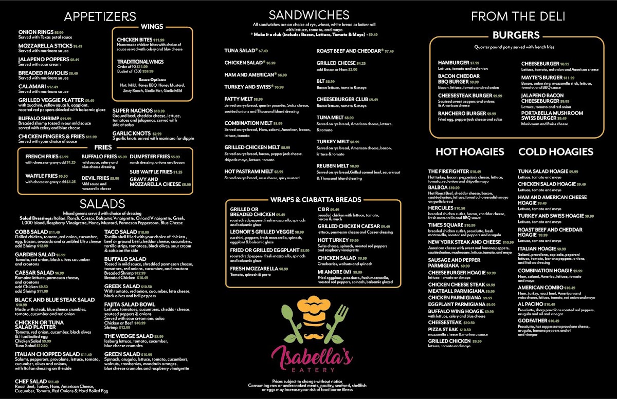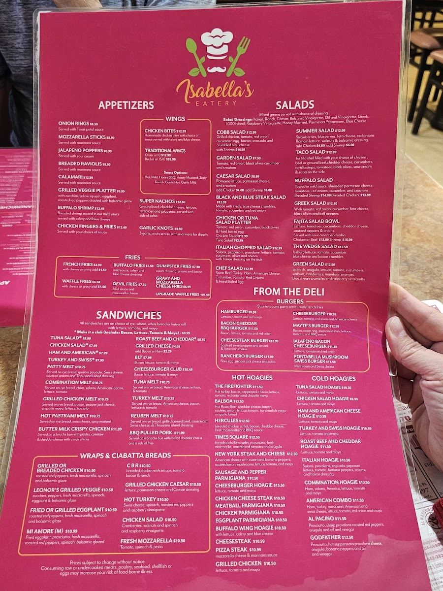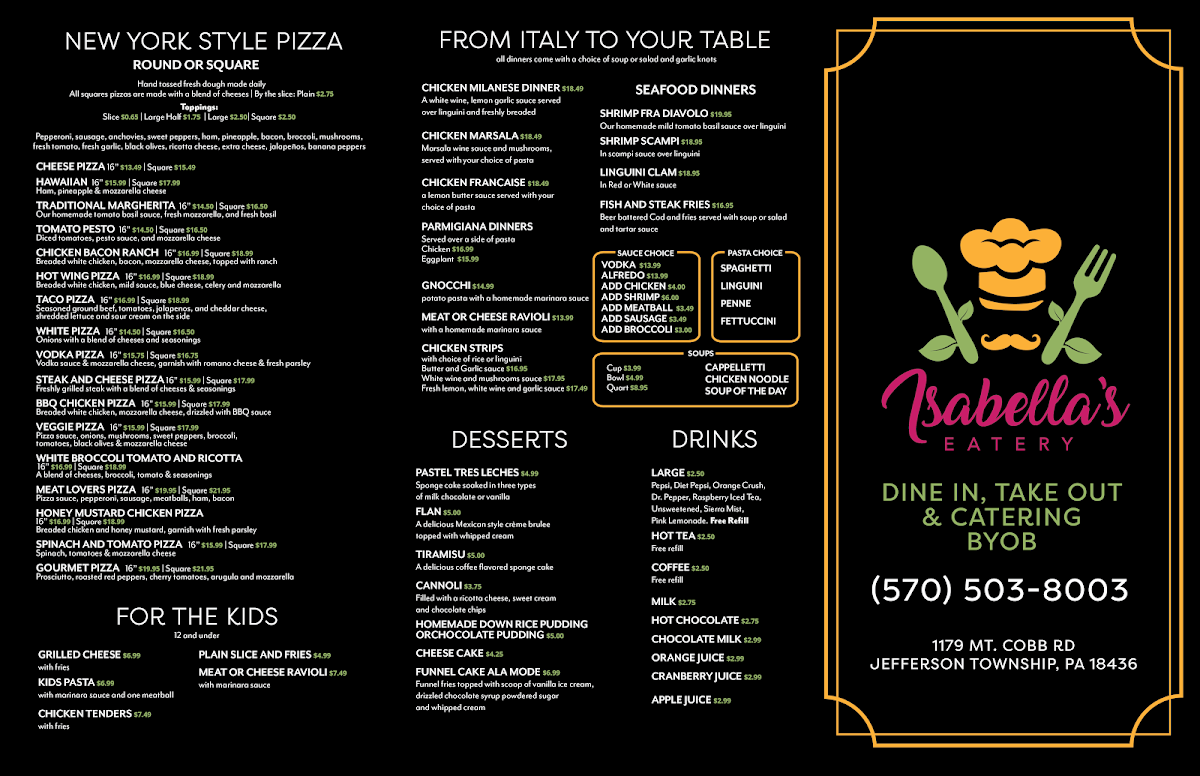 Tucked away on Mt Cobb Rd, Isabella's Eatery Menu brings a cozy charm to casual dining in Mt Cobb, PA. The menu captures the essence of comfort food with a creative touch - from hearty breakfast plates and classic sandwiches to satisfying entrees that feel like home-cooked favorites. Every dish is prepared with fresh ingredients, balancing familiar flavors with a few delightful surprises that keep regulars coming back. Whether you’re in the mood for a juicy burger, a crisp salad, or a generous pasta portion, there’s something for everyone to enjoy. The atmosphere complements the food perfectly - relaxed, friendly, and just right for unwinding with friends or family after a long day. With generous portions and honest flavors, Isabella’s Eatery turns simple meals into memorable moments, making it a local favorite worth exploring.