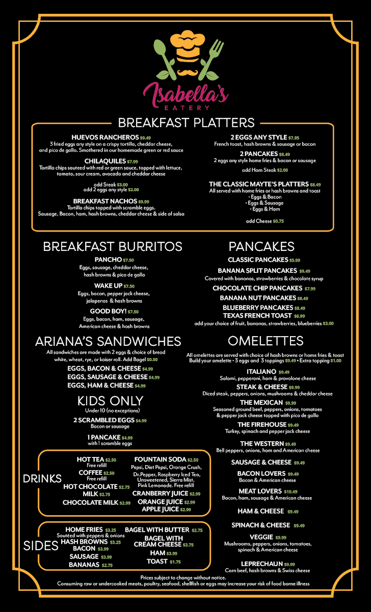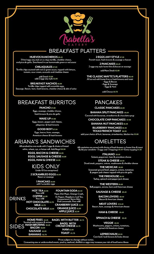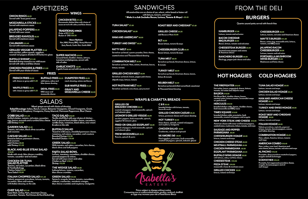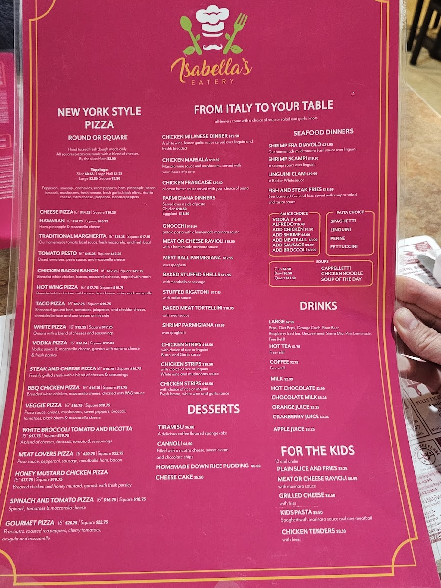 Tucked away on Mt Cobb Rd, Isabella's Eatery Menu brings a cozy charm to casual dining in Mt Cobb, PA. The menu captures the essence of comfort food with a creative touch - from hearty breakfast plates and classic sandwiches to satisfying entrees that feel like home-cooked favorites. Every dish is prepared with fresh ingredients, balancing familiar flavors with a few delightful surprises that keep regulars coming back. Whether you’re in the mood for a juicy burger, a crisp salad, or a generous pasta portion, there’s something for everyone to enjoy. The atmosphere complements the food perfectly - relaxed, friendly, and just right for unwinding with friends or family after a long day. With generous portions and honest flavors, Isabella’s Eatery turns simple meals into memorable moments, making it a local favorite worth exploring.